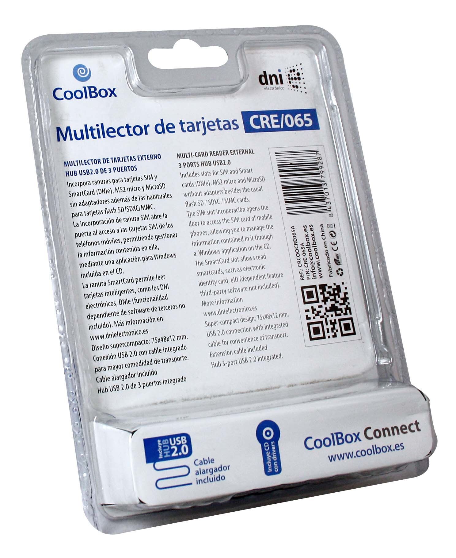 CoolBox CRE-065. Tipos de Cartão de Memória: Memory Stick (MS), microSDXC, miniSD, MMC, MS Duo, MS Micro (M2), MS PRO Duo, SD, SDHC, SDXC. Bus PCI: USB 2.0. Velocidade real de transferência: 480 Mbit/s. Cor da caixa: Preto. Requisitos mínimos do sistema: USB