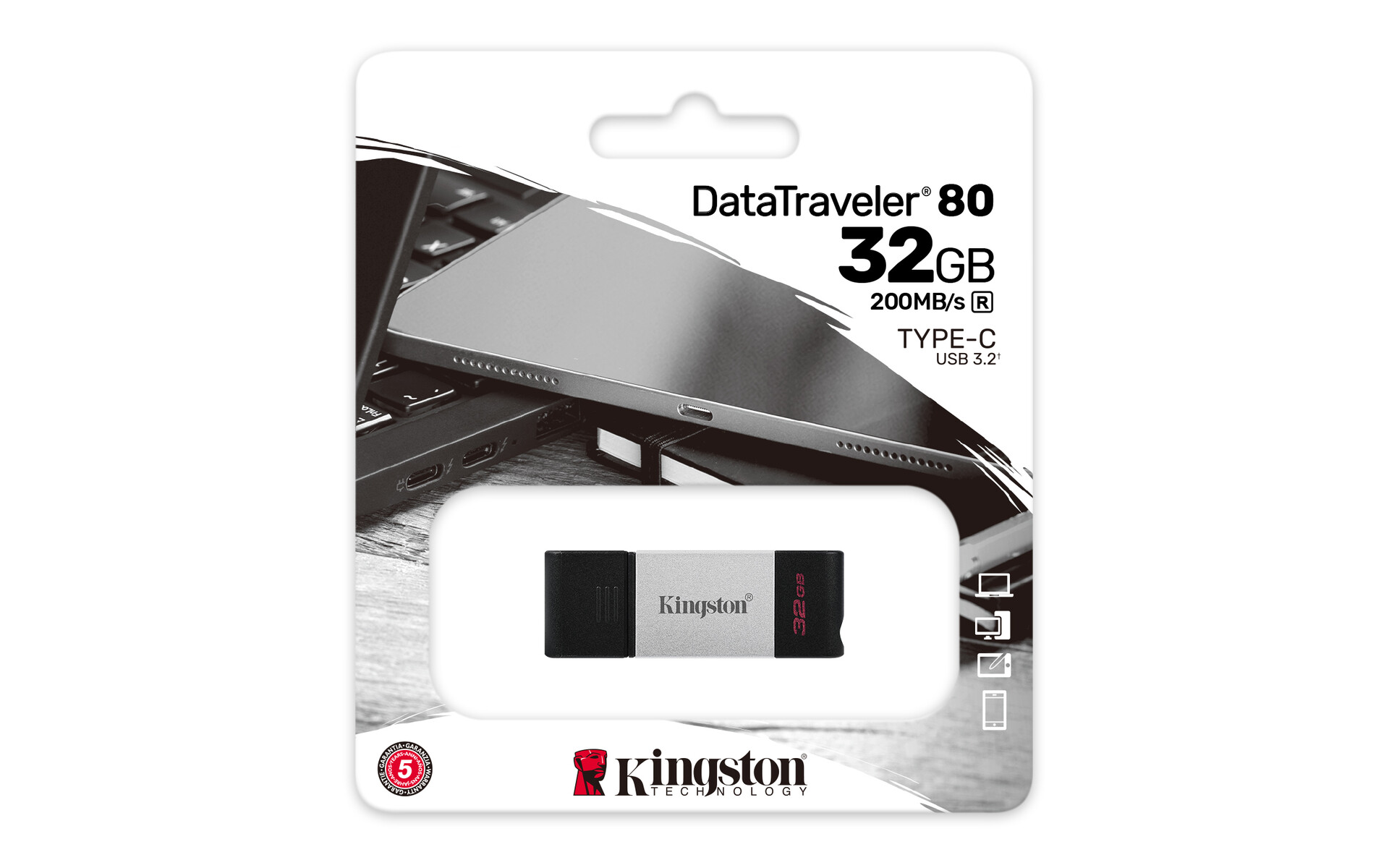 Kingston Technology DataTraveler 80. Capacidade: 32 GB, Interface de dispositivo: USB Type-C, Versão USB: 3.2 Gen 1 (3.1 Gen 1), Velocidade de leitura: 200 MB/s. Fator forma: Tampa. Peso do produto: 4,134 g. Cor do produto: Preto, Prateado