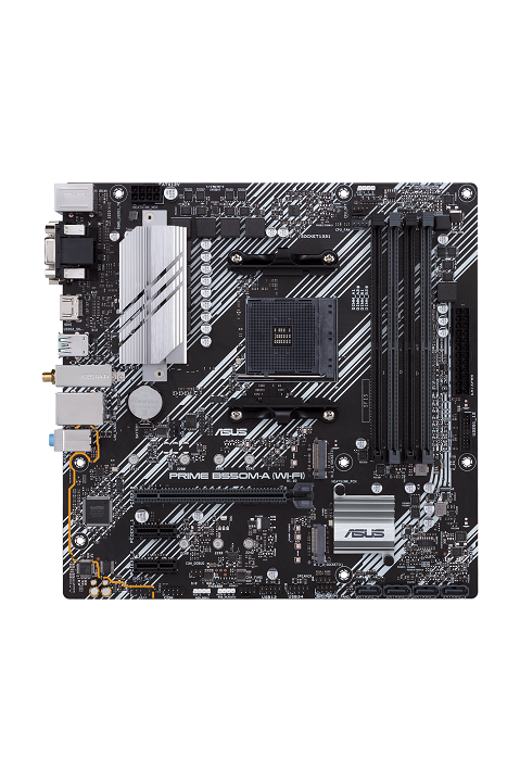 ASUS PRIME B550M-A (WI-FI). Fabricante do processador: AMD, Socket de processador: AM4, Processador: AMD Ryzen. Tipos de memórias suportadas: DDR4-SDRAM, Tipo de memória slots: DIMM, Memória máxima: 128 GB. Interfaces suportadas de armazenamento: ATA serial III.